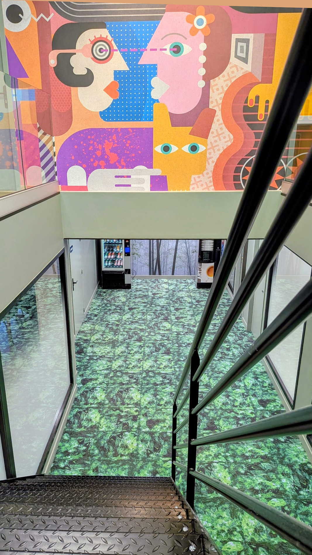 Graphismes végétaux, couleurs audacieuses, ambiance singulière… les dalles textiles façon forêt stylisée ont crée une ambiance originale, dynamique et ressourçante jusque dans les espaces de pause et de passage. On aime tout particulièrement le contraste avec le mural graphique et la transparence des vitrages, qui donne vie au sol et anime la circulation du lieu.